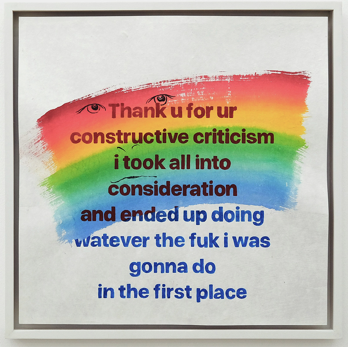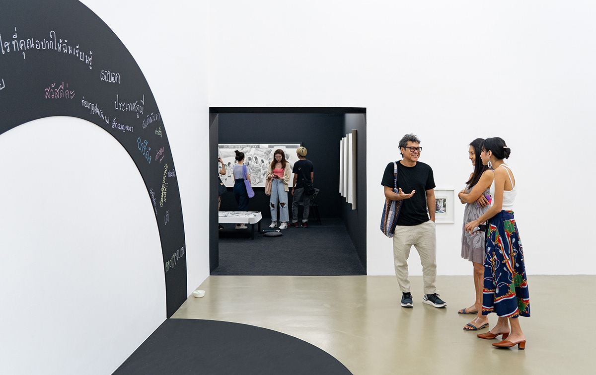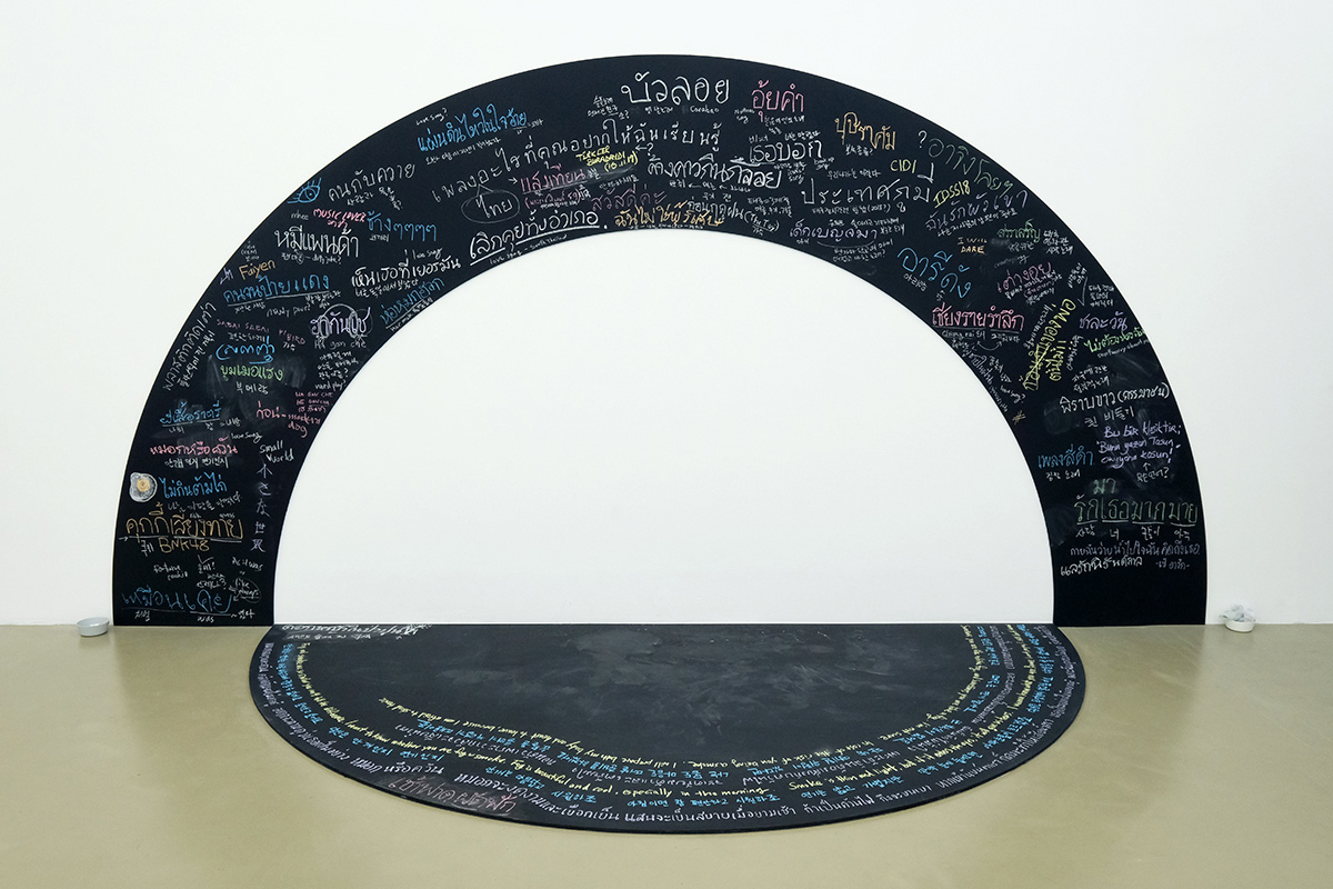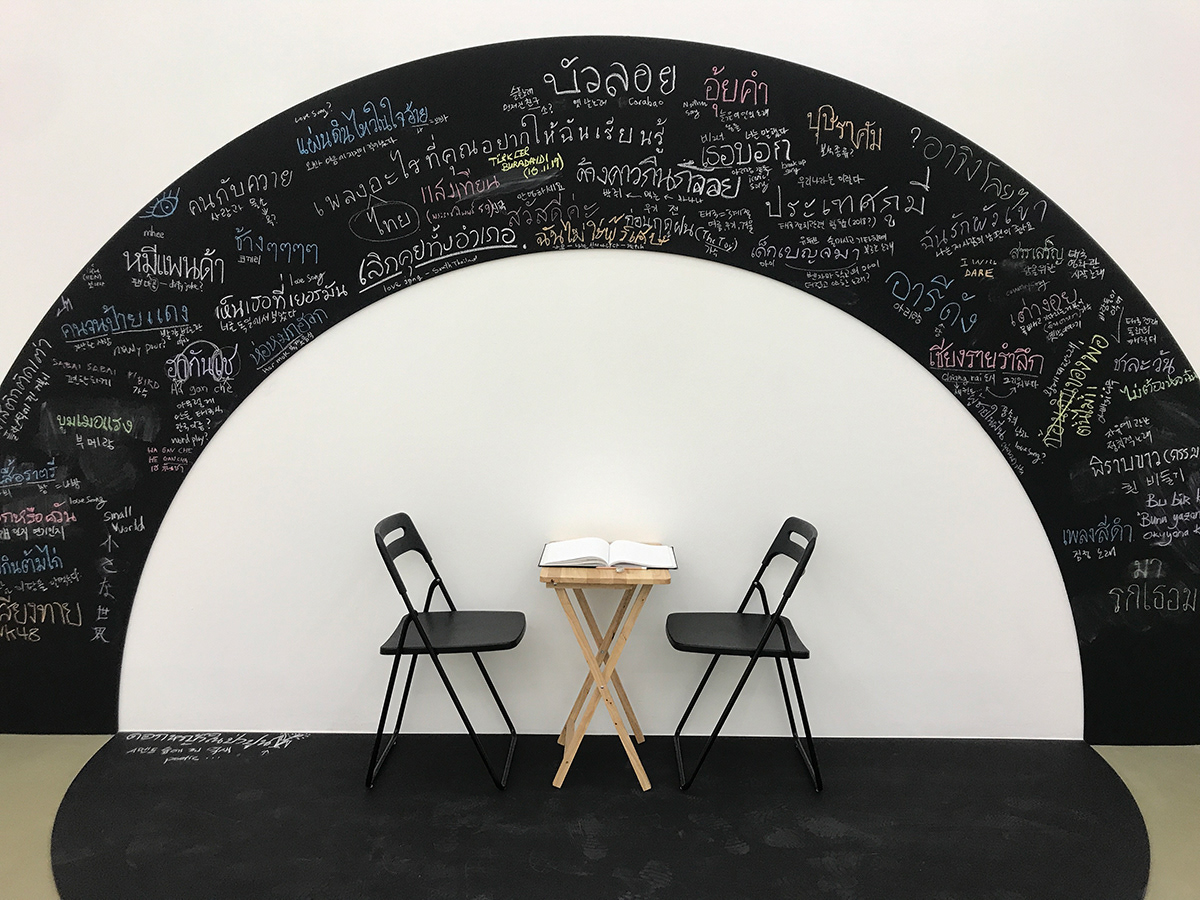 Just as the durational aspect and open-endedness of the works stand in contrast to many traditional or commercial shows, the exhibition’s lack of finality and clear purpose sets it even further apart, calling artistic production into question. By locating its opening date closer to the beginning of her Bangkok visit rather than its end, Lee undertakes what could be viewed as an anti art residency - or is it perhaps the ultimate art residency. The reversed timeline allows Under the Rainbow to act as a framework from which exchanges in three or more languages are derived instead of being directed at or feeding the more self-centered objective of a final show.