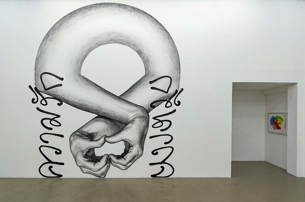The larger-than-life, monochromatic mural that greets the visitor’s eye upon entering the gallery is a ‘device’, as per the artist / an ‘interface’, as per this writer. A joined pair of hands arches above viewers, forming the initial contact point between the artist and ourselves. The drawing is absolutely silent but speaks of a song, and this tension lingers throughout the exhibition.