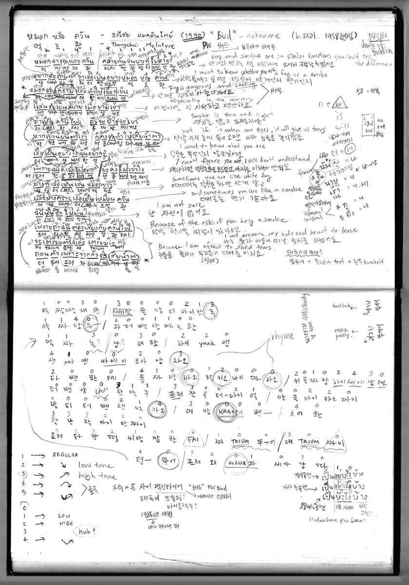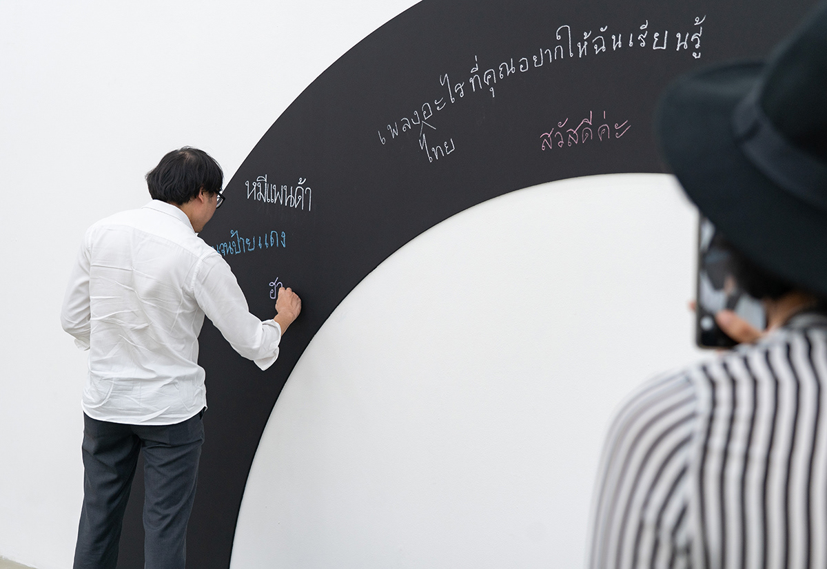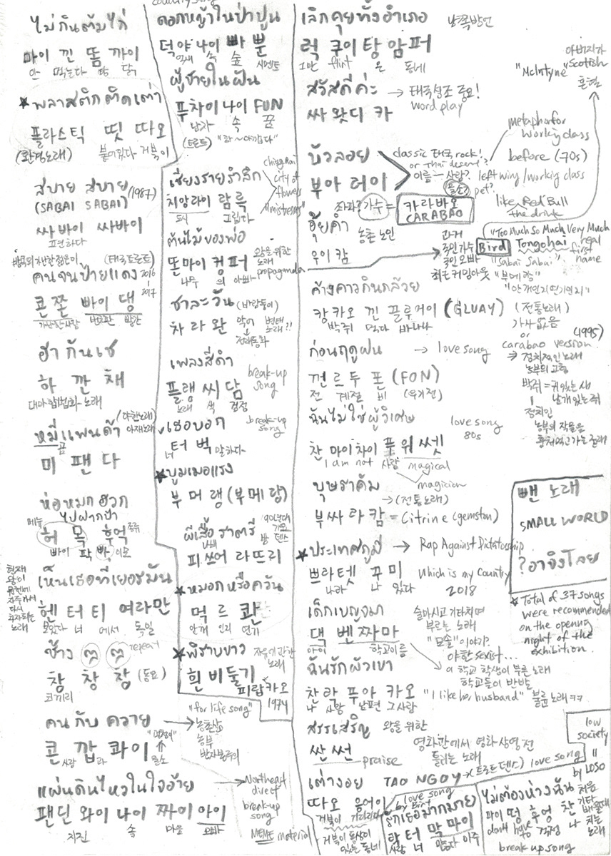역설적으로, 통역사를 동반하여 태국 노래 한 곡을 배우는 과정을 담은 <타이 배우기>는 (긍정적 의미에서) 매우 이기적인 작품이다. 외국어 노래 한 곡을 부를 수 있다고 해서 그 언어를 일상에서 써먹을 기회는 드물 것이기 때문이다. 마찬가지로 추천곡을 칠판에 쓰는 관람객의 행위는 현지 문화 중 특징적 일부를 공유하고 가르쳐주려는 지극히 개인적인 욕구를 반어적으로 드러내고 있다.