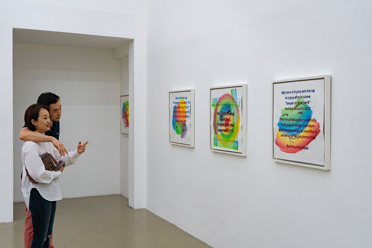 태국 방콕에서 열리는 이유진의 개인전 <무지개 아래>의 준비 과정은 그리 특별하지는 않지만, 관객을 완전히 몰입시키는 무언가가 있다. 어떻게 보면 변화무쌍한 인생 궤도, 창의적 협동 관계, 그리고 전시기획사업 등이 가지는 변동성에 관한 꽤 평범한 뒷이야기이기도 한데, 본래 컬럼비아 미술대학원 동기였던 니콜 말루프와의 2인전(혹은 협동 전시)으로 기획되었던 본 전시의 취지는 몇 년에 걸쳐 변형되어 마침내 현재의 모습으로 자리 잡게 된다.