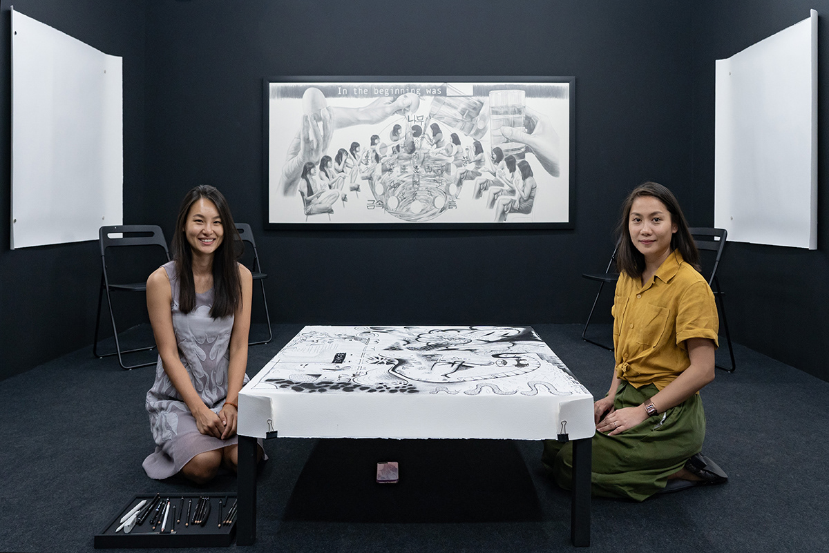 Inviting seven Thai artists to collaborate with her on six drawings on paper - each of them produced in publicly held sessions - Yujin Lee initiated a series of rules framing her ‘drawing conversations’.