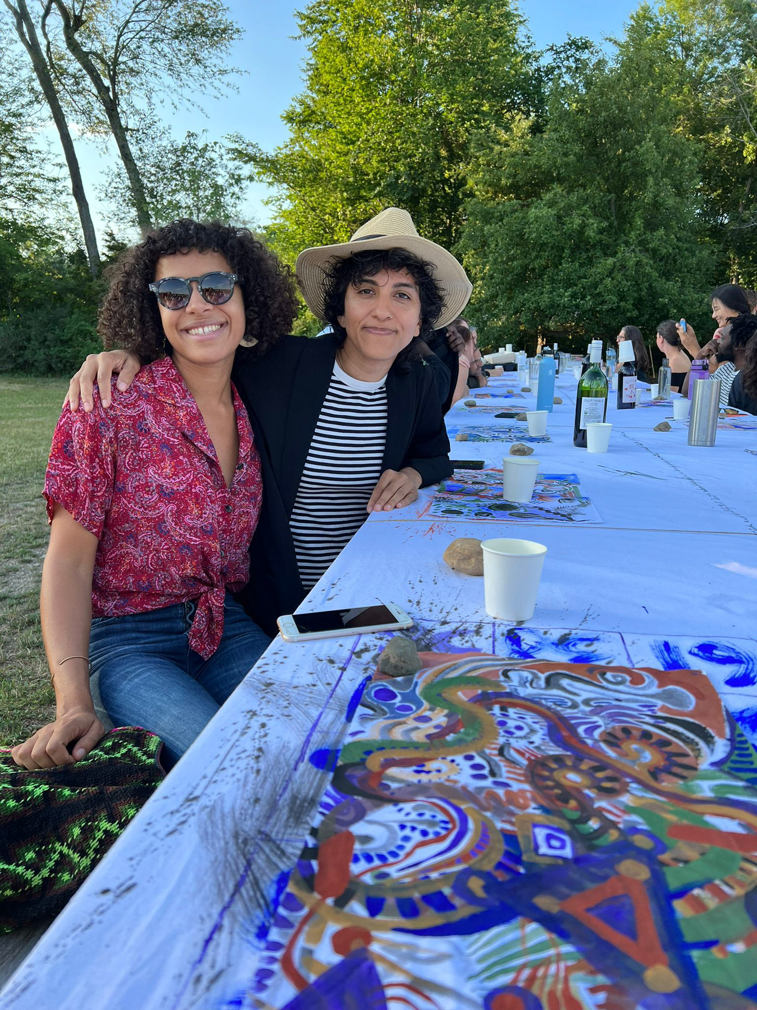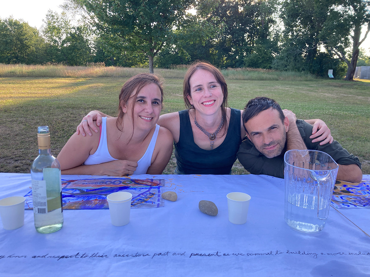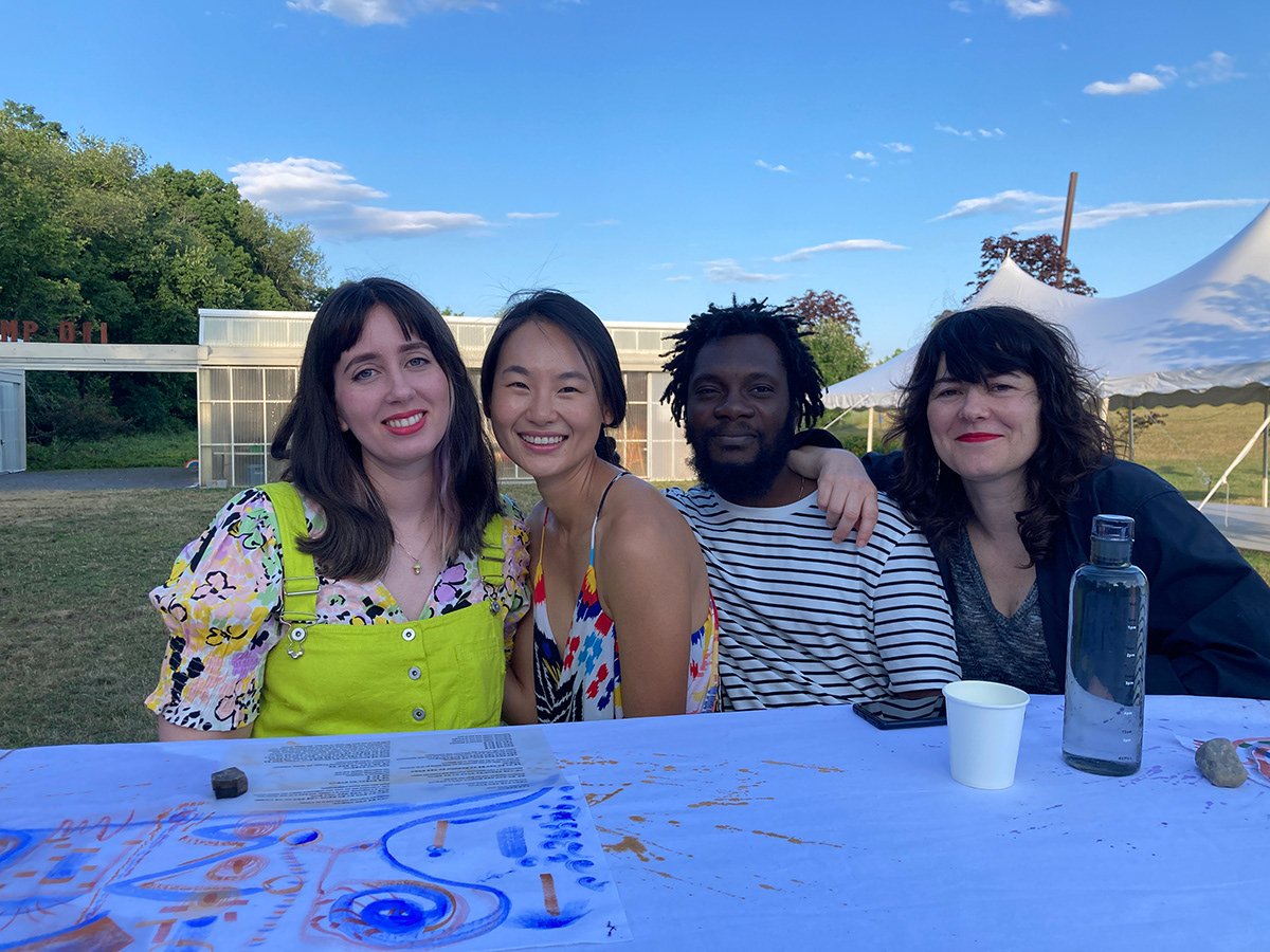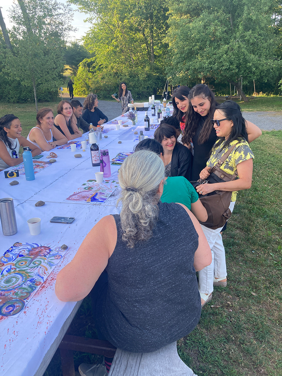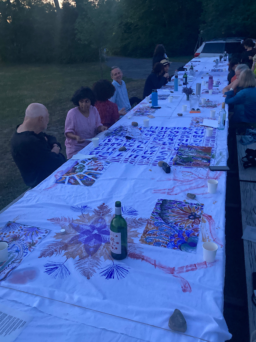 A painting that is also a tablecloth, a curtain, a tent, and an amulet was activated on July 14th, 2022, during a special picnic dinner for the resident artists of 2022 Art Omi: Artist and special guests. Along with a series of 20 collaborative paintings titled, Painting Conversation, being used as placemates, A painting that is also a tablecloth, a curtain, a tent, and an amulet became a tablecloth. The event was hosted by artist Jean Shin’s monumental picnic table, Allée Gathering, located at the Art Omi Sculpture Park. Welcomed by Shin’s sculpture–a place to gather together for conversation, observation, and reflection–the participants of the event collectively activated A painting that is also a tablecloth, a curtain, a tent, and an amulet, imbuing it with many stains, memories, and meanings to be carried on through the painting.