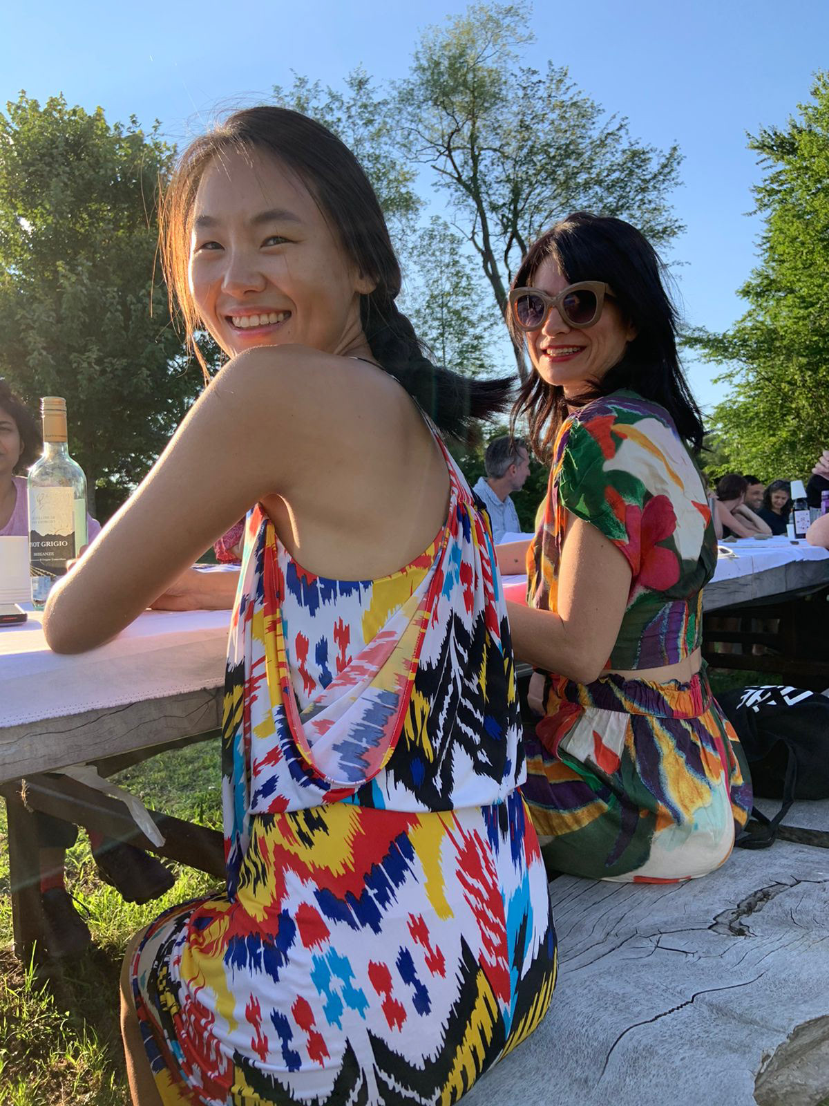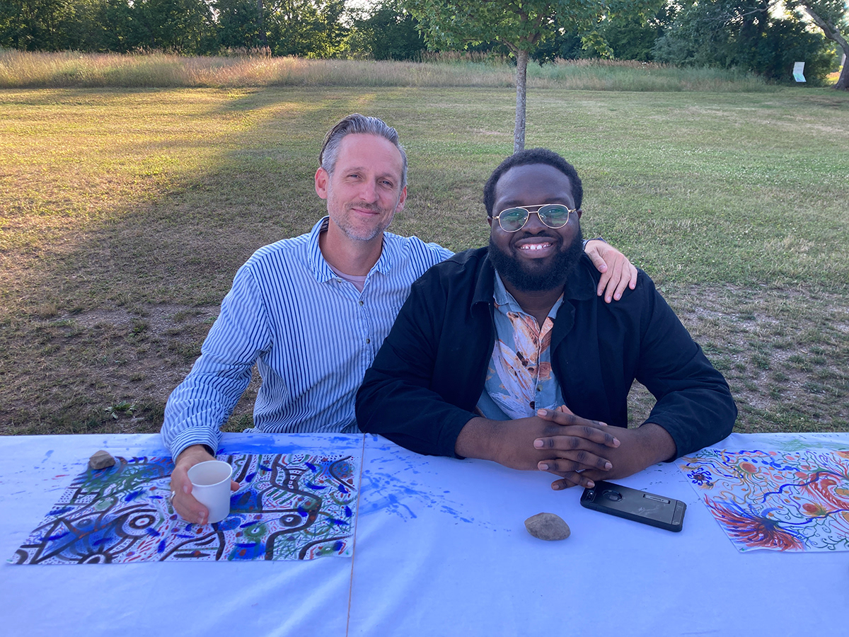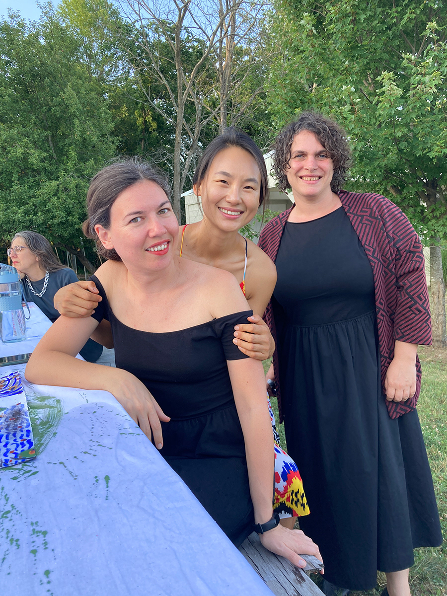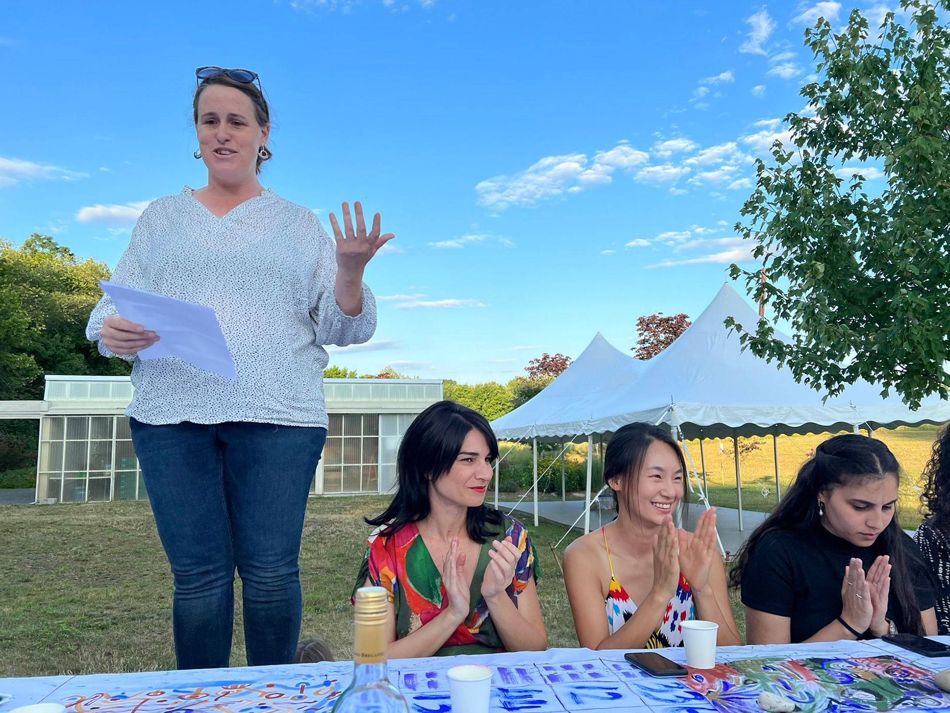 A painting that is also a tablecloth, a curtain, a tent, and an amulet was activated on July 14th, 2022, during a special picnic dinner for the resident artists of 2022 Art Omi: Artist and special guests. Along with a series of 20 collaborative paintings titled, Painting Conversation, being used as placemates, A painting that is also a tablecloth, a curtain, a tent, and an amulet became a tablecloth. The event was hosted by artist Jean Shin’s monumental picnic table, Allée Gathering, located at the Art Omi Sculpture Park. Welcomed by Shin’s sculpture–a place to gather together for conversation, observation, and reflection–the participants of the event collectively activated A painting that is also a tablecloth, a curtain, a tent, and an amulet, imbuing it with many stains, memories, and meanings to be carried on through the painting.