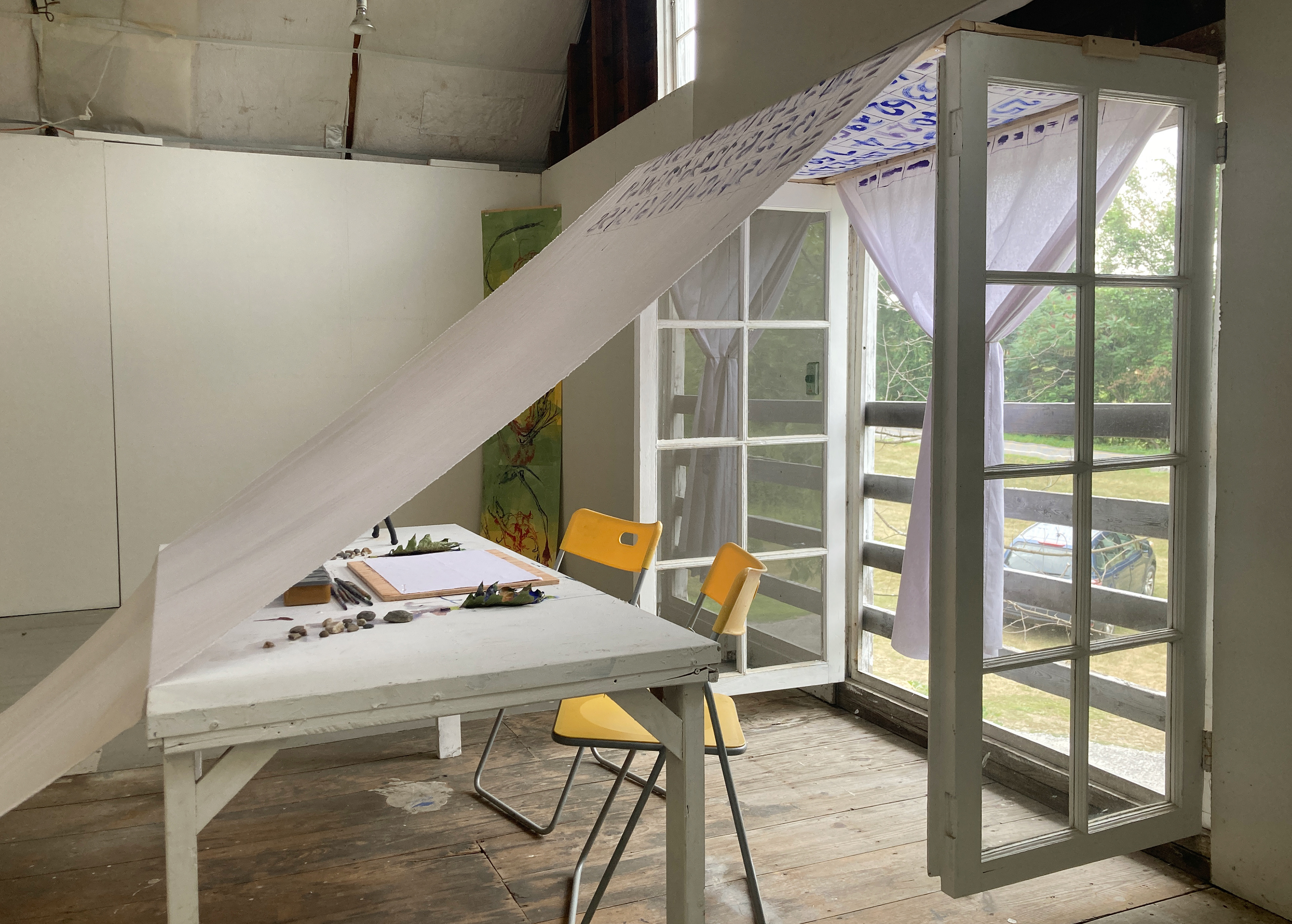 Throughout Art Omi: Artist Residency (June 23 - July 18, 2022), A painting that is also a tablecloth, a curtain, and an amulet was installed in the studio like a tent, creating a private space to host the Painting Conversation, which often brought about an intimate verbal conversation between the artist and the participant.